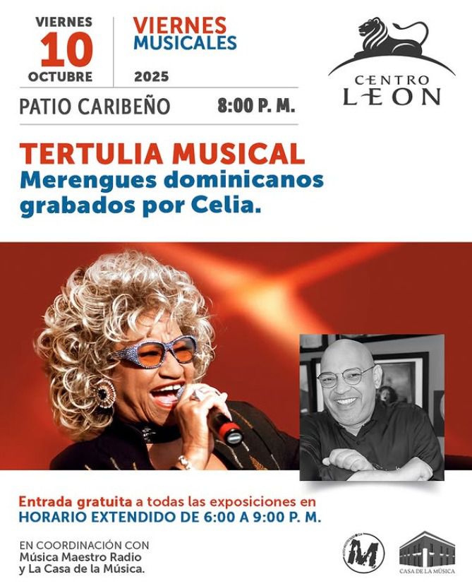 Viernes musicales / Tertulia musical. Disfruta de la próxima Tertulia musical «Merengues dominicanos grabados por Celia». Alexis Méndez, investigador y productor de la plataforma musical educativa Música Maestro, nos permite conocer las canciones en las que fundamenta esta investigación, parte de las actividades por la celebración del centenario de nacimiento de Celia Cruz. Este viernes 10 de octubre a las 8:00 p.m.