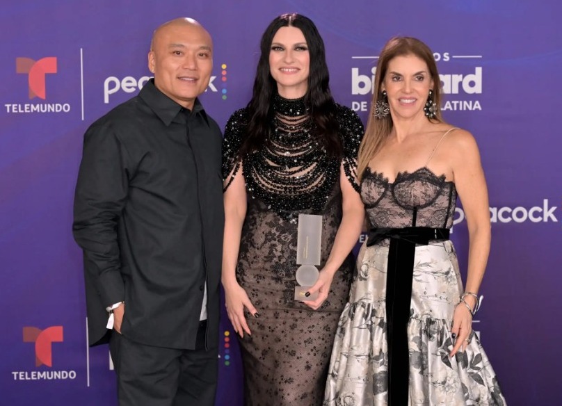 Peso Pluma, uno de los más nominados y quien fue distinguido con el Premio Vanguardia, llegó vestido de esmoquin, con la camisa abierta y un lazo desamarrado. En su brazo estaba su pareja y también artista Kenia OS, quien llevaba un 'body' de pedrería y una falda de red negros, al que le dio color con una boa azul rey. Laura Pausini escogió un traje negro de encaje hasta el suelo, sobre el que llevaba un top de pedrería negra que fungía como la principal pieza de joyería.lc