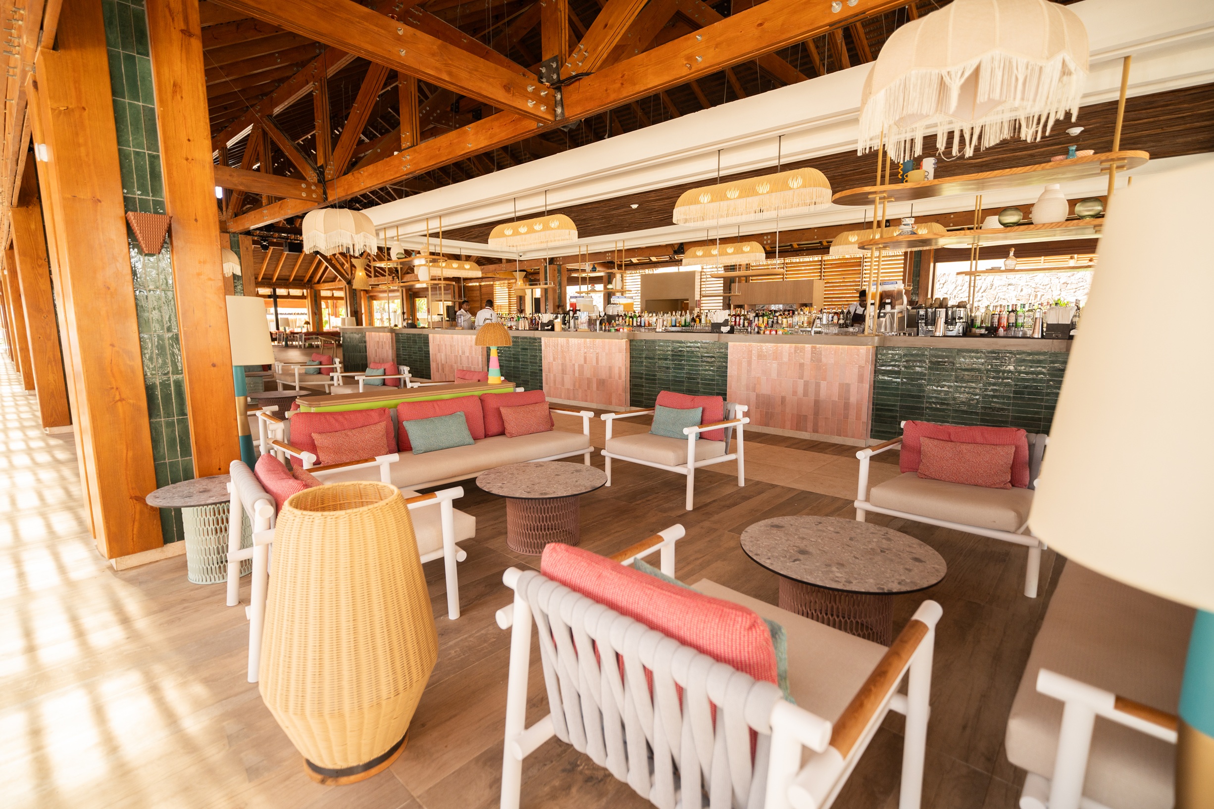 Nuevo bar principal con estilo boho-chic, colores brillantes, barra central y vistas al mar. Perfecto para cócteles de día o noche.