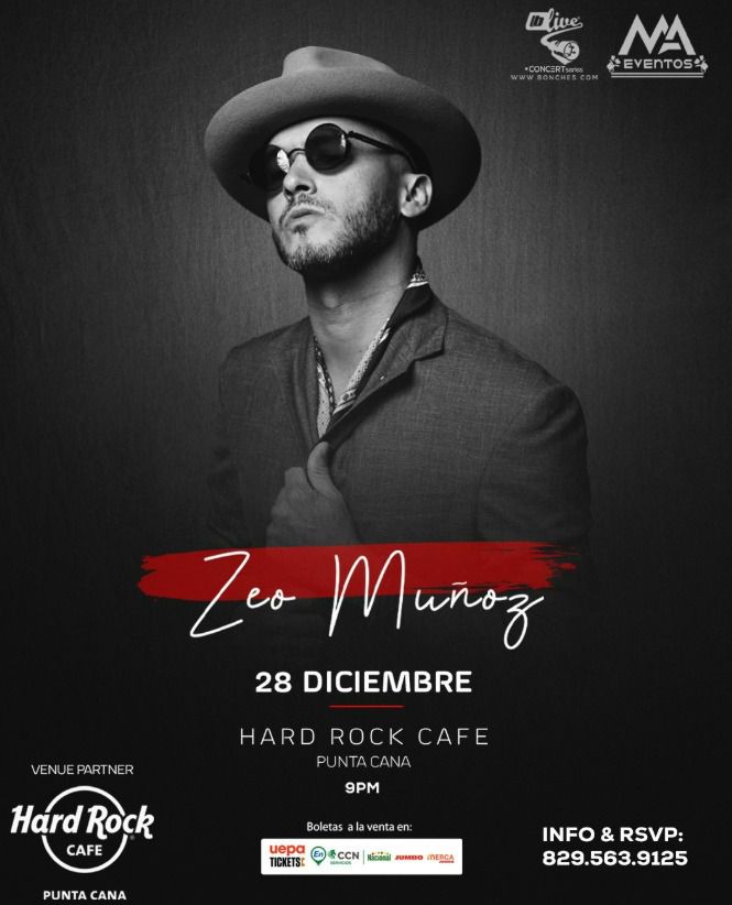 Zeo Muñoz - Punta Cana. Domingo 28 de Diciembre, 9:00 P.M.📍Hard Rock Café, Punta Cana.
