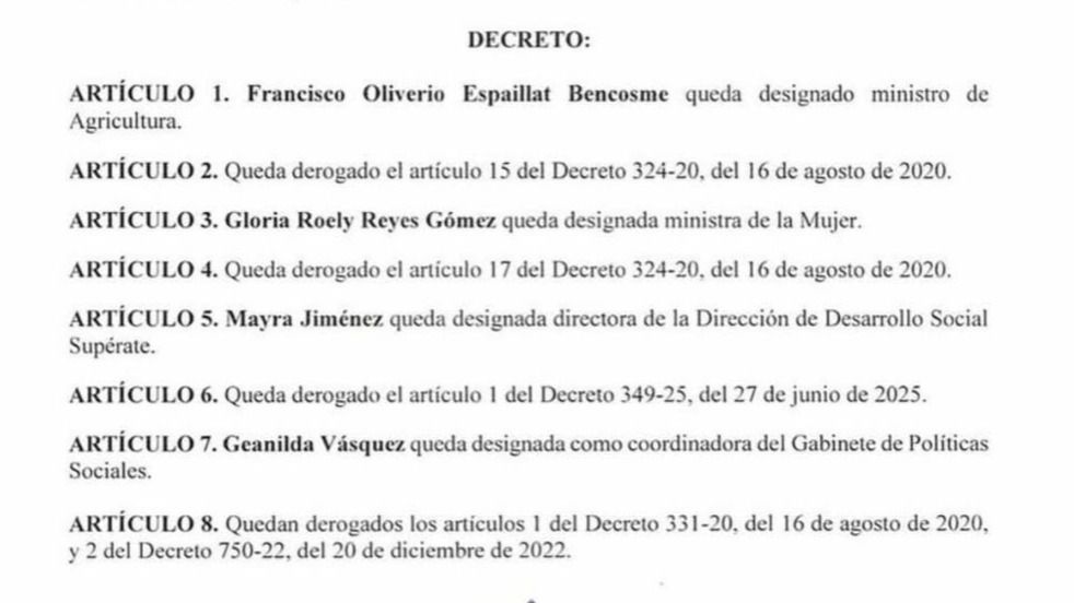 El decreto también deroga varios artículos de disposiciones emitidas entre los años 2020 y 2025, incluyendo partes de los decretos 324-20, 331-20, 349-25 y 750-22, como parte de un proceso de reorganización institucional. Estas medidas buscan actualizar la estructura del Poder Ejecutivo y redefinir responsabilidades en áreas clave como la política social, la agricultura y la atención a poblaciones vulnerables, en el marco de los ajustes administrativos impulsados por el Gobierno.lc