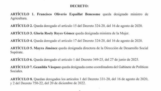 Santo Domingo.- El presidente Luis Abinader emitió el Decreto núm. 2-26, mediante el cual dispuso una serie de nombramientos y derogaciones en distintas áreas de la administración pública, en ejercicio de las atribuciones que le confiere el artículo 128 de la Constitución. La disposición designa a Francisco Oliverio Espaillat Benosme como ministro de Agricultura y a Gloria Roely Reyes Gómez como ministra de la Mujer. Asimismo, Mayra Jiménez fue nombrada directora de la Dirección de Desarrollo Social Supérate y Geanilda Vásquez asumirá como coordinadora del Gabinete de Políticas Sociales.