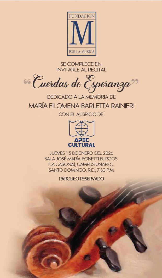 La Fundación M por la Música presenta el recital "Cuerdas de Esperanza" en homenaje a María Filomena Barletta Rainieri, el 15 de enero de 2026, a las 7:30 p.m. en la Sala José María Bonetti Burgos, UNAPEC, Santo Domingo. Se ofrecerá parqueo reservado para los asistentes.