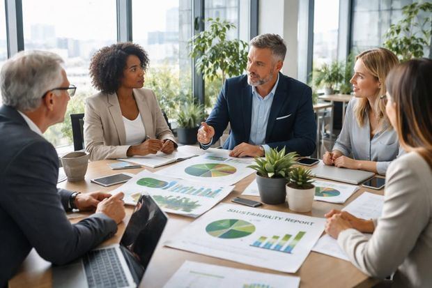 Ejecutivos en oficina discuten estrategias de sostenibilidad, rodeados de gráficos y plantas bajo luz natural.