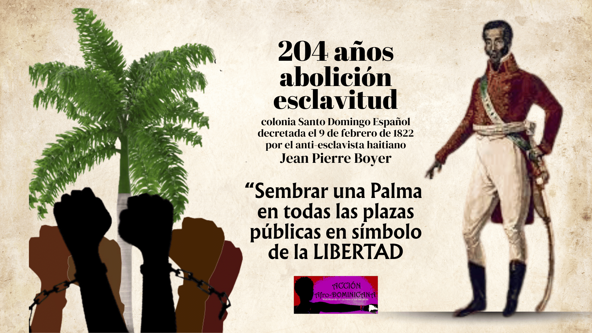 A 204 años de aquel decreto histórico del antiesclavista Juan Pedro Boyer, Acción Afro-Dominicana reafirma que la abolición de la esclavitud no es un hecho del pasado, sino una memoria viva en disputa, frente a un presente marcado por formas contemporáneas de semiesclavitud, racismo institucional y despojo de derechos, como la sentencia 168-13. La organización reiteró su exigencia de que el 9 de febrero sea reconocido oficialmente como Día Nacional de la Abolición de la Esclavitud, como acto de justicia histórica y reconocimiento del aporte decisivo del pueblo afrodescendiente a la construcción de la nación dominicana. Exigencia también demandada por el intelectual Miguel Solano, que más tarde se unirá con otro video y quien nos ha adelantado su llamado al presidente Luis Abinader a que se anime a ganarse un lugar en las efemérides y emita un decreto declarando al 9 de febrero como el «Día Quisqueyano de la Libertad» -Quisqueyano debe ser discutido por ser un nombre fruto del colonialismo.lc