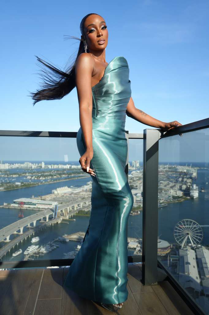 Amara La Negra acaparó todas las miradas en Premios Lo Nuestro 2026 al lucir un impactante diseño iridiscente del creador Valentino Omar, reafirmando su lugar como referente de estilo en la industria latina. En la gala celebrada en el Kaseya Center en Miami, la artista dominicana apostó por un vestido de silueta columna en tono verde jade con matices aqua, confeccionado en una tela satinada de acabado técnico y microtextura visible que capturaba la luz con un efecto casi líquido.