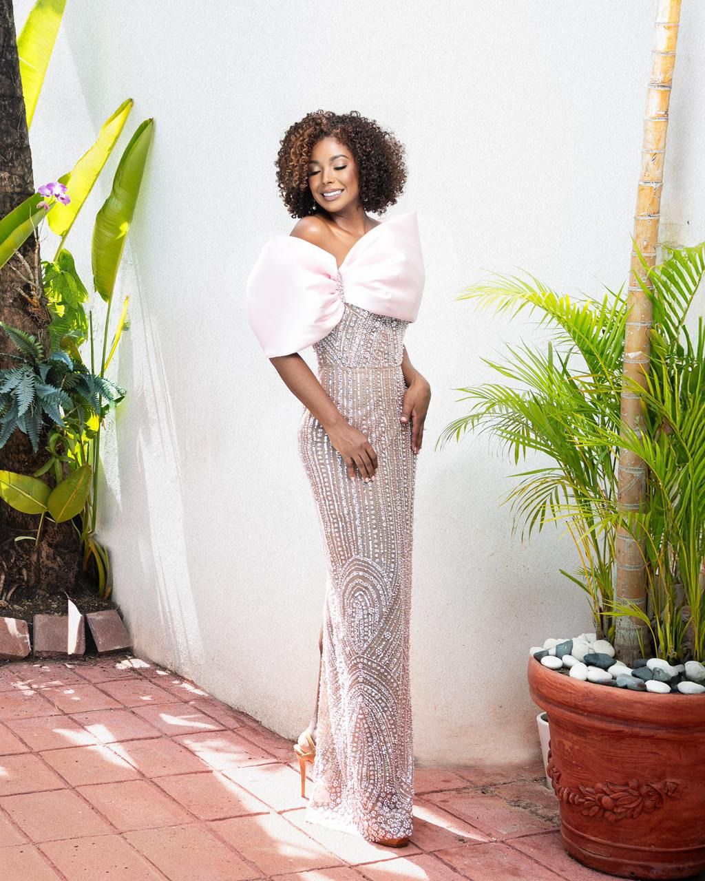 La hermosa Ruth Ocumarez apostó por llevar su cabello natural completamente suelto, sin artificios, sin concesiones, dejando que su textura hable por sí sola. Además, lució un vestido de gala ajustado tipo sirena, completamente bordado con pedrería y detalles brillantes en tonos nude/rosados, lo que le da un efecto luminoso y sofisticado.