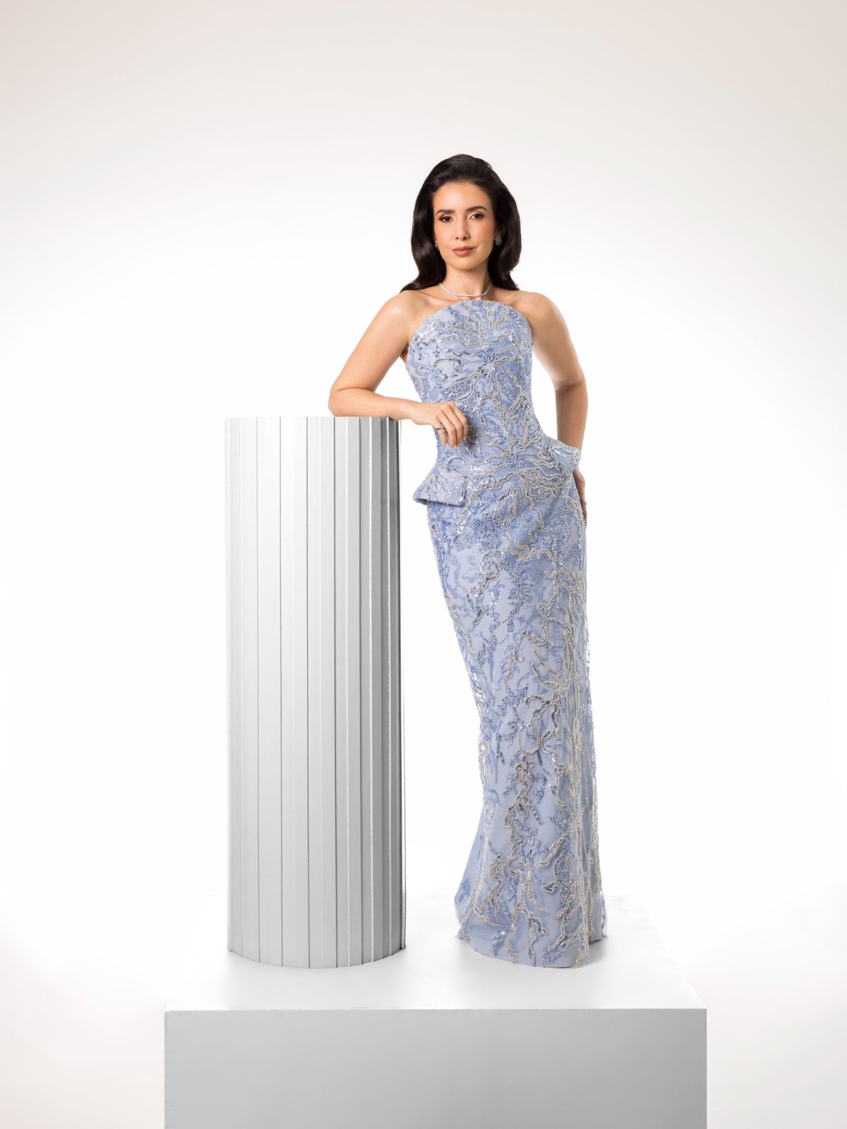 Por su parte, la comunicadora Karina Alarcón apostó por una propuesta etérea en azul cerúleo, uno de los colores en tendencia. Su diseño, también firmado por Suzelle Taveras, destacó por su elegancia delicada, silueta fluida y estética contemporánea, logrando una imagen sofisticada y femenina. Complementado con un estilismo cuidado y joyas de lujo, su aparición reafirmó su posición como una de las figuras más elegantes de la velada.