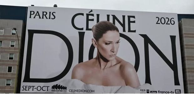 Un cartel anunciando el regreso a los escenarios de la cantante canadiense Céline Dion.
