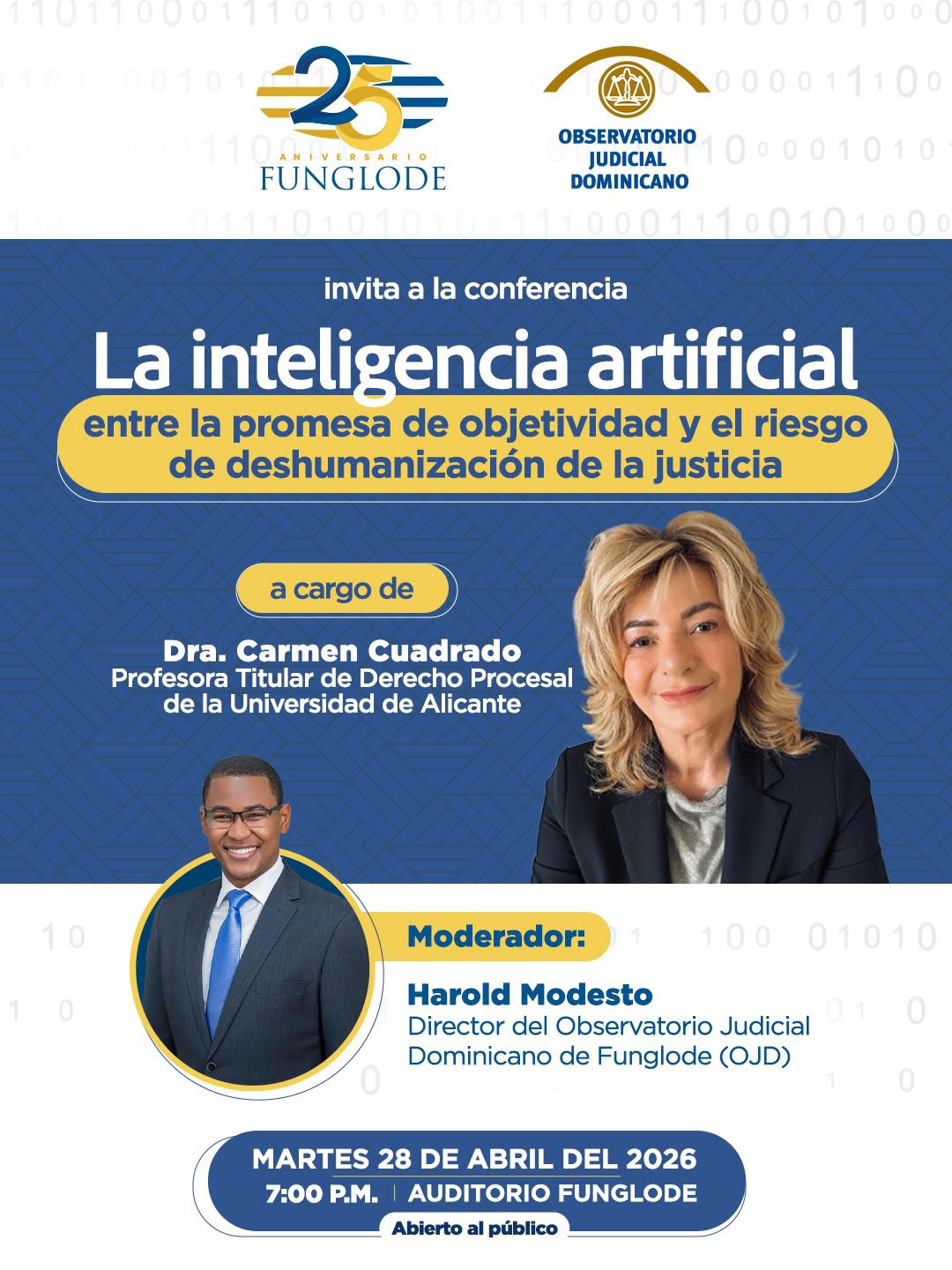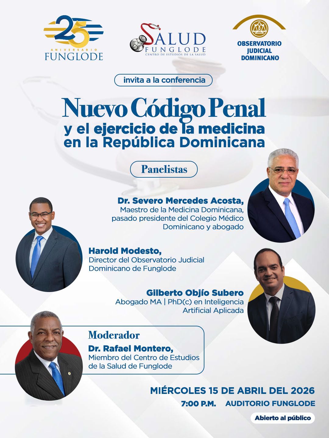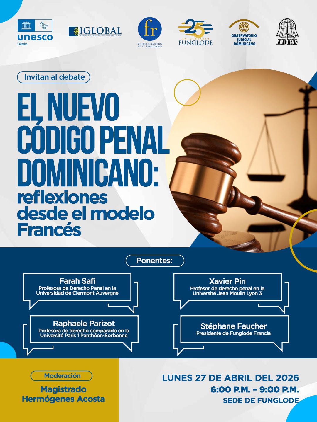 La Fundación Global Democracia y Desarrollo (Funglode) organiza varios eventos en abril de 2026, incluyendo un ensayo sobre su historia y método, discusiones sobre el nuevo código penal dominicano, y una conferencia sobre inteligencia artificial en la justicia, con destacados facilitadores y panelistas.