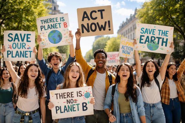 Jóvenes activistas protestan en una plaza, sosteniendo pancartas bajo un cielo azul y rodeados de edificios históricos. (Foto: Imagen generada por inteligencia artificial - Cibeles AI)
