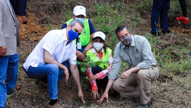 El mandatario se hizo acompañar del ministro de Medio Ambiente, Orlando Jorge Mera, dando inicio al plan con la siembra de árboles en la cuenca alta del río Nizao, una de las más productivas del país y donde se intervendrán 400 tareas de tierra con 10 mil plantas de pino criollo (Pinus occidentallis), cedro (Cedrela odorata) y café.