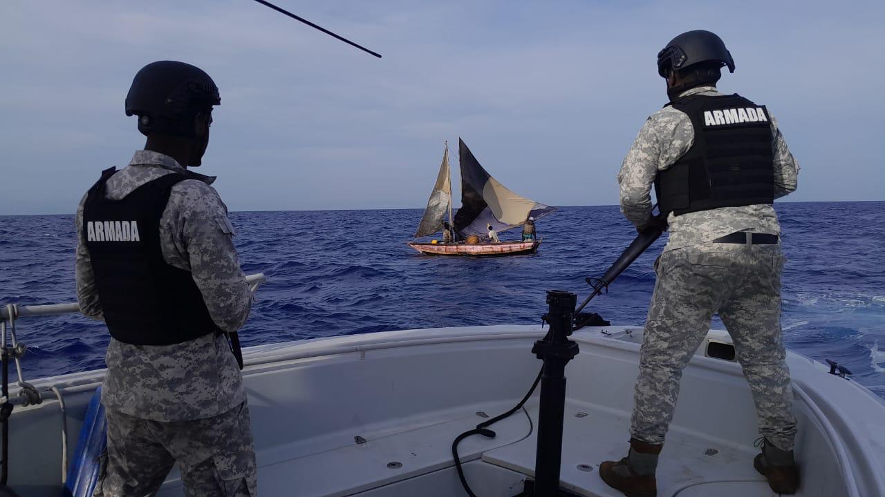Durante la operación, unidades navales interceptaron una embarcación de fabricación artesanal de aproximadamente cuatro metros de eslora, (13 pies), en la que viajaban tres ciudadanos haitianos implicados en actividades de pesca ilegal.